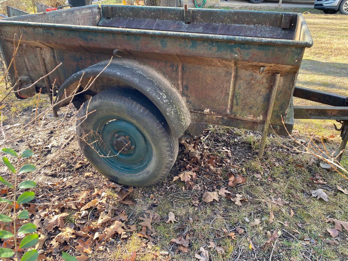 | 1950’s Willies jeep with folding windshield, opening hood, steering wheel, good tires, one hubcap is not a match. trailer has open/close tailgate |