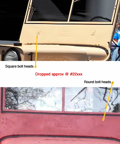 3. Square bow holder bolts on the windshield: Bolts were inserted through the windshield to afix small hangers to the windshield. These hangers were used to carry the straight portions of the soft top bows (the curved portions were intended to be stored on the side of the jeep). The bow holder bolts changed from square to round about 22XXX.