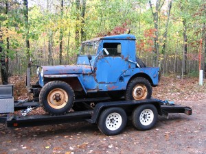 I envied the previous owner’s ability to restore the 1946 CJ2A and I started thinking it would be a fun project. So, I kept an eye out for a project jeep. It didn’t take long when an article appeared in our local newspaper (Wisconsin State Journal) about a vacation resort in Eagle River. The article included a photo showing some resort guests – a mother and her young daughter- sitting on the hood of a CJ2A in the middle of the woods! The jeep looked to be in pretty good shape from what the photo showed. So, I got the phone number for the resort, called, and eventually got connected with the jeep’s owner. We talked over the phone a couple times and I eventually went to look at it. The body was much rougher than the photo showed, with lots of rust, dents, and holes in the floor. Also, it wasn’t running. But, the frame looked very solid, and everything seemed to be there. My dad, who’d tagged along to see what I was getting myself into, took one look the jeep and did an about-face. He thought it was too far gone. I decided to make and offer any ways and wound up hauling it home. My father and I started working on the motor and we got it running within a few weeks time. In fact, I recently took the jeep for a spin with no brakes or seats down my street! To my amazement, it seemed to shift smoothly and handled well. This is the blue jeep shown with a hard top.