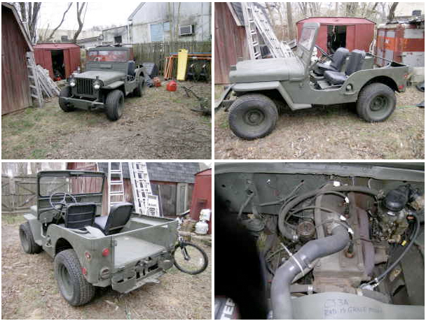 “Old willys painted OD green to look like an Army Jeep. Original Flathead 4 cyl engine no title. $1700. Also have a military M38a1 with a title, plow and spare chassis for $2500. Ive run the engine but the brakes need attention. Its been sitting for awhile. $2500. Call 301-529-3340”