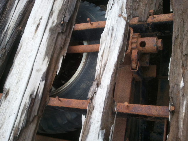 Here’s an FC-170 that was used for years by a farmer to feed his cattle. But he had a problem, how could he stand on the back of the FC and toss the hay off the back and drive at the same time? His solution was his custom auto pilot contraption. He would get the Jeep going, attached his ‘auto pilot’ and then climb into the back and throw out hay as he drove along.