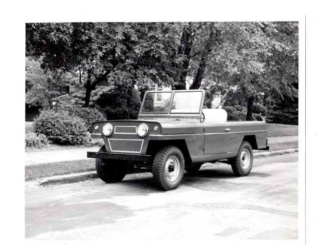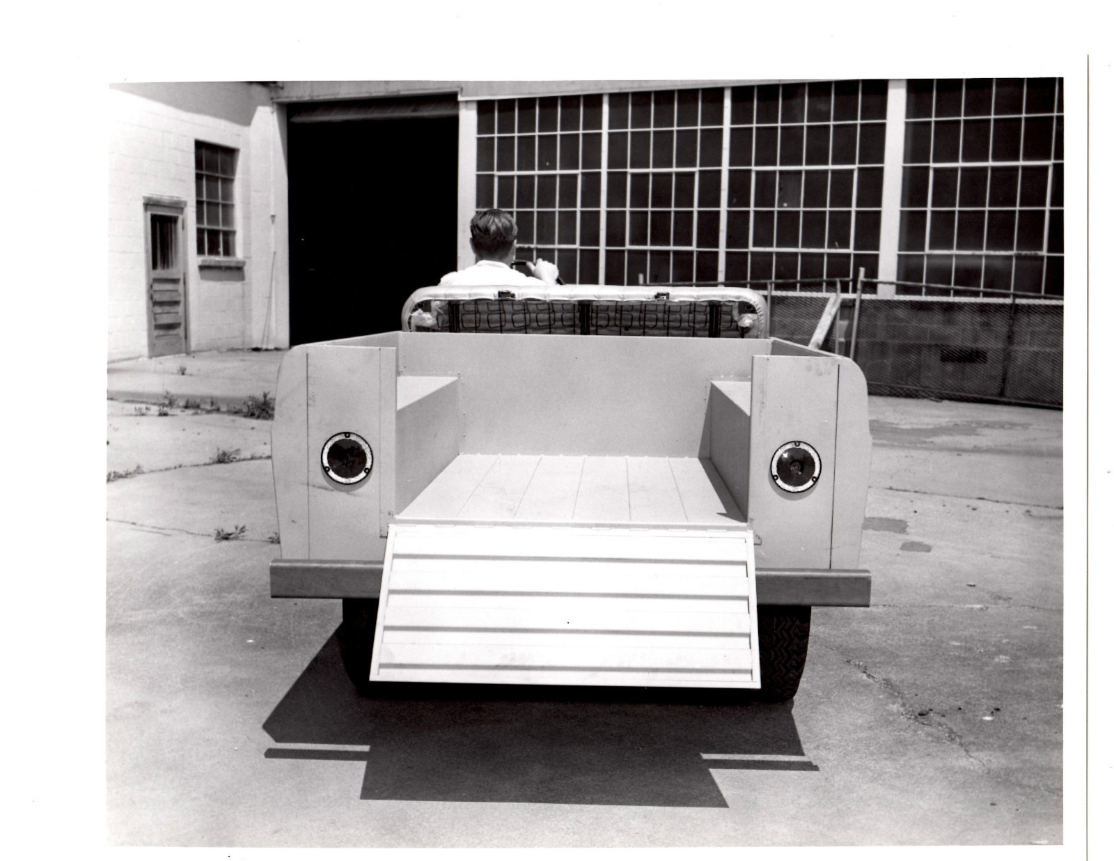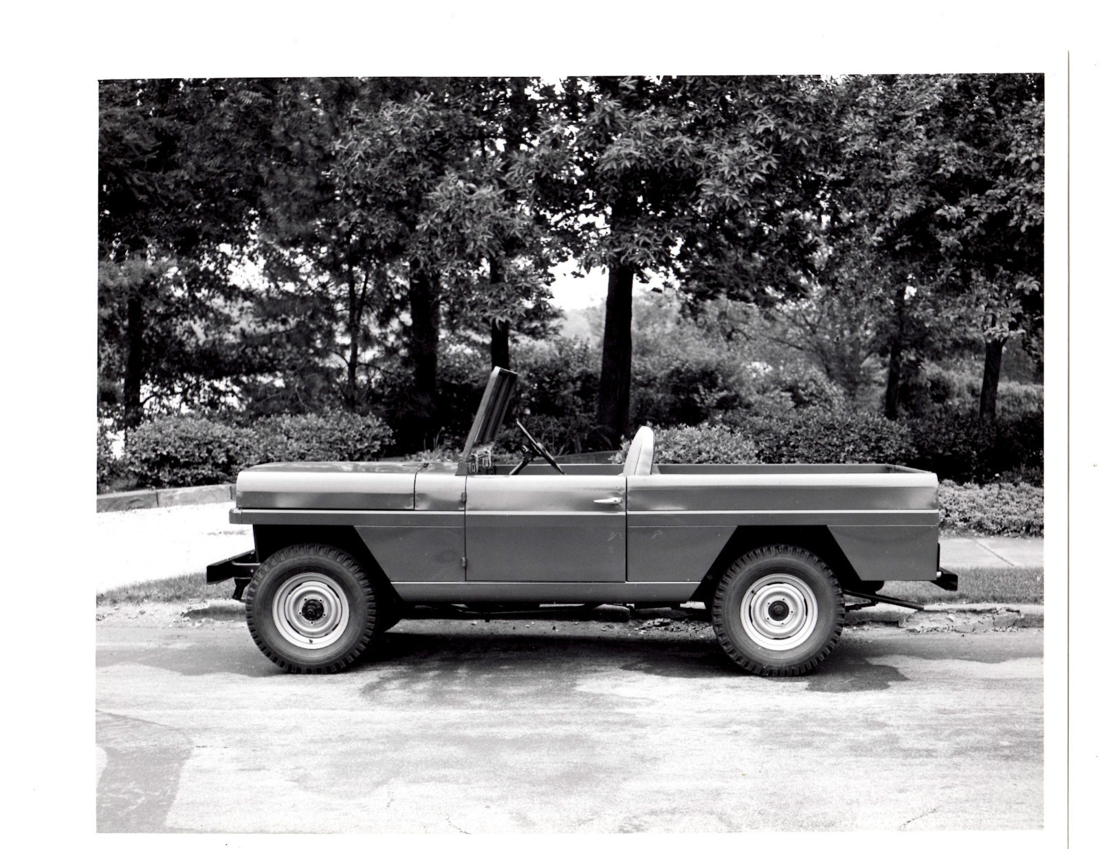 These are prototypes that came out of a study that began shortly before or after the introduction of the Wagoneer and Gladiator trucks. Kaiser Jeep wanted to jump into the export markets and was considering a CKD (Complete Knock Down) concept were complete rolling chassis would be sent to satellite “mini-factories” in other countries. It was called the “Export Low Investment Program.” Kaiser Jeep designed simple bodies that could be produced locally with minimal tooling. In a product planing booklet, they proposed vehicles based on a J200 Gladiator chassis and on CJ-5 and CJ-6 chassis. Several visual concepts were proposed that look similar to these, the main difference being the front end. There are images of a running J200 prototype but only artist’s renderings of the CJ-5 version. These appear to be based on a CJ-6. The J200 prototype utilized the Gladiator grill. These pics were taken in whatever facility was being used to produce the Fleetvan, a number of which are in the background ins some of these shots. It’s likely the prototype work was being done in the same facility.