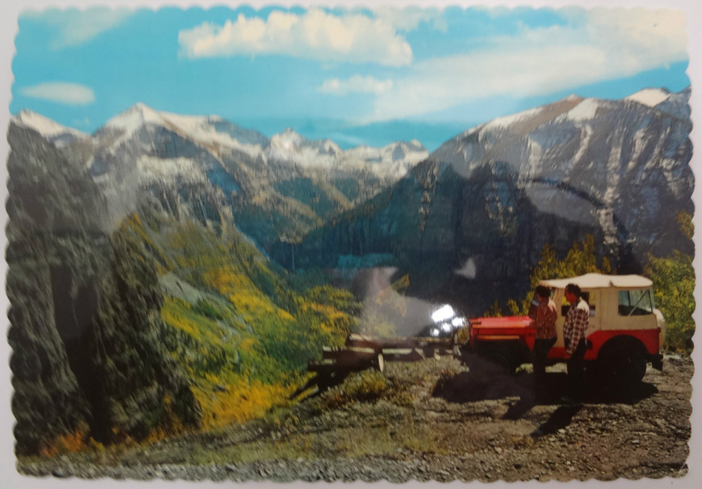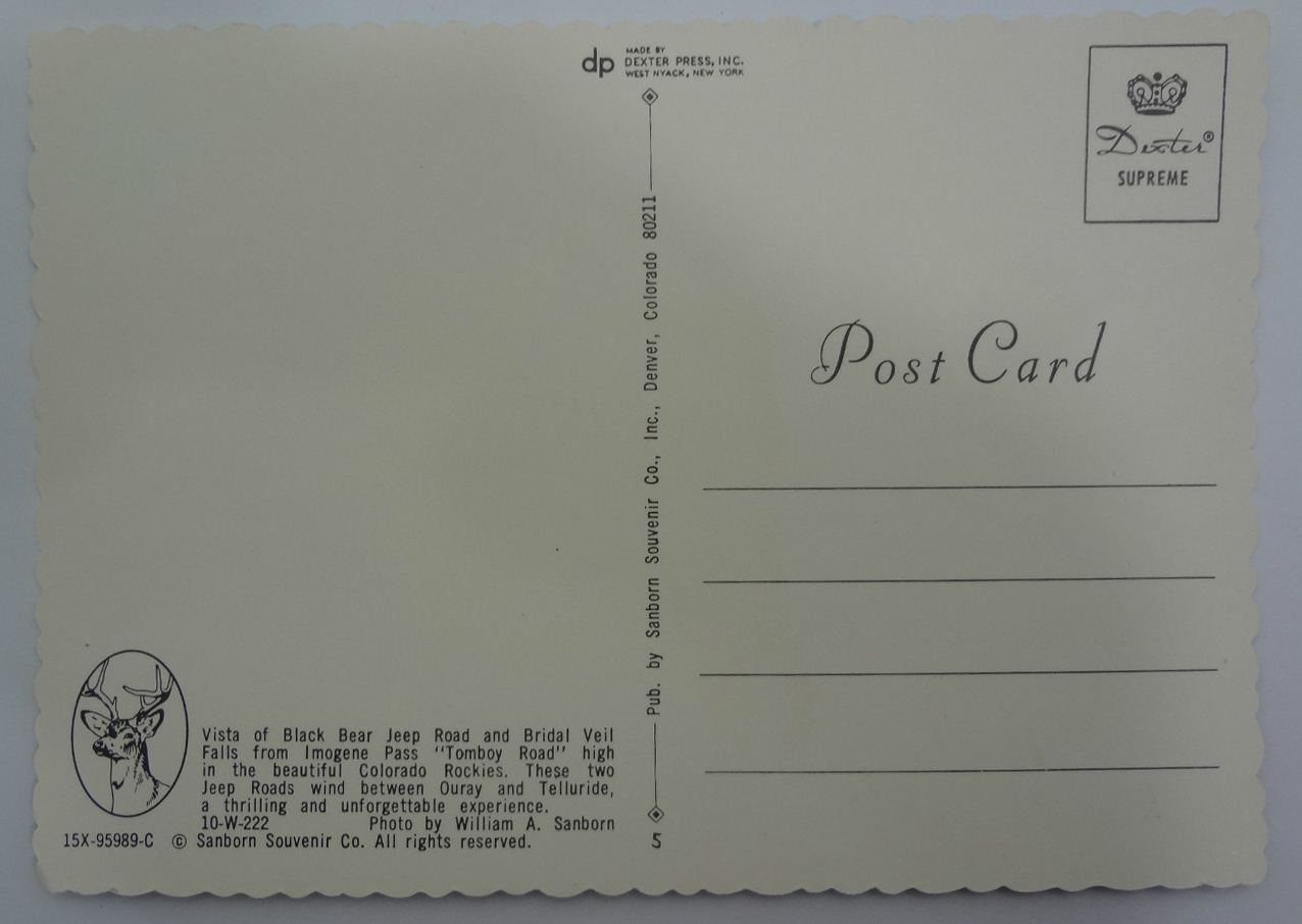“Colorado Postcard of Colorado Rockies Jeep Road – Photo by William A. Sanborn. These roads wind between Ouray and Telluride. Measures approximately 6″ x 4″. Has scalloped edging. Card is slightly bowed and corners are dinged (see pics.).”
