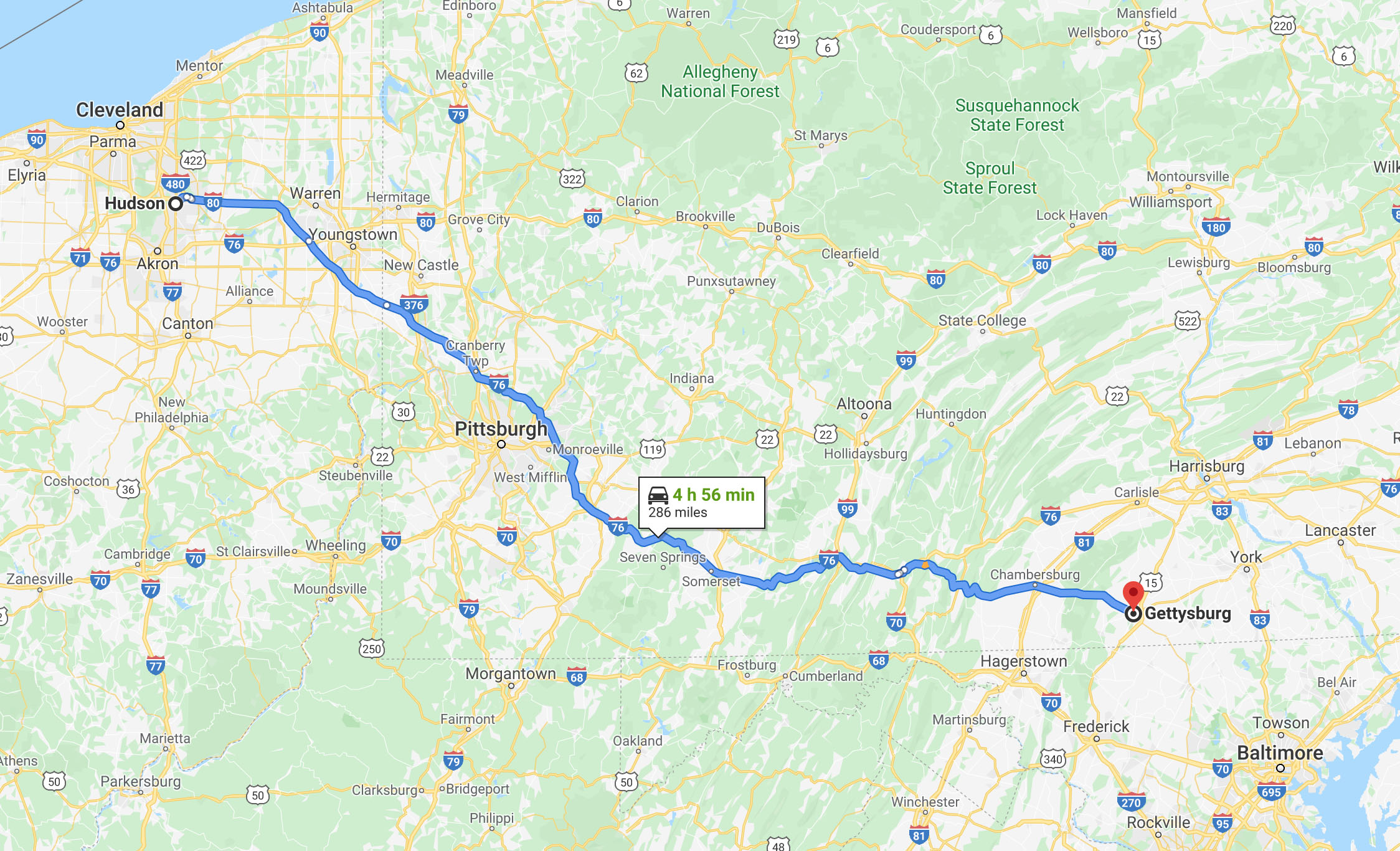 Sunday’s drive from Hudson, Ohio, to Gettysburg.