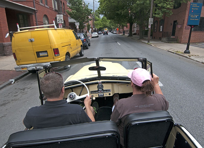 Our goal today was Bill Reiss’ Lime Street Carriage in downtown Lancaster. Ronks is only a short drive away, so it didn’t take long for us to get there. When we arrived at Bill’s, he showed us around his current showroom of jeeps (and other vehicles) for sale. He explained that he’s in the middle of a renovation. His building was formerly a Studebaker dealership and other businesses. He laughed about the seven layers of carpet and three false ceilings he’s torn out of one area of the building. On the plus side, he was able to open up a great deal of space. Even though there’s plenty of work left, it’s easy to see how great the space will be when he’s done.