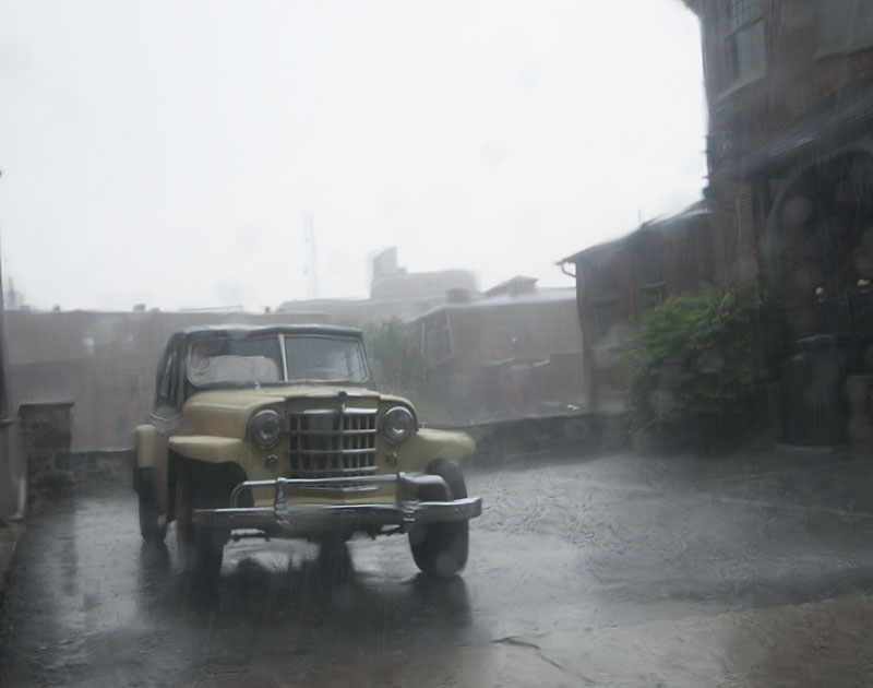 Eventually, it rained so hard we (meaning mostly Bill and Henry) installed the top’s sides (See top pic to watch Henry in action). Then, we all pushed the Jeepster into a parking lot, piled into Henry’s Jaguar, and drove away.