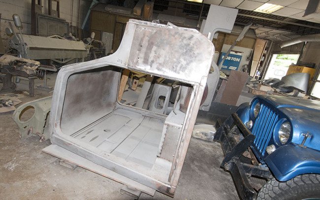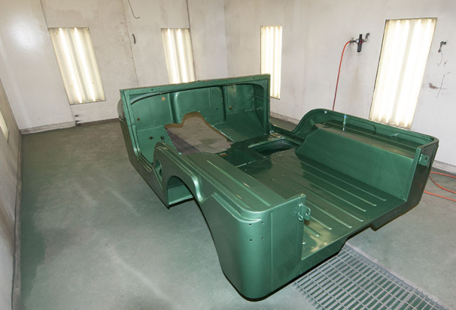 A rebuild CJ-5 body in the paint room.