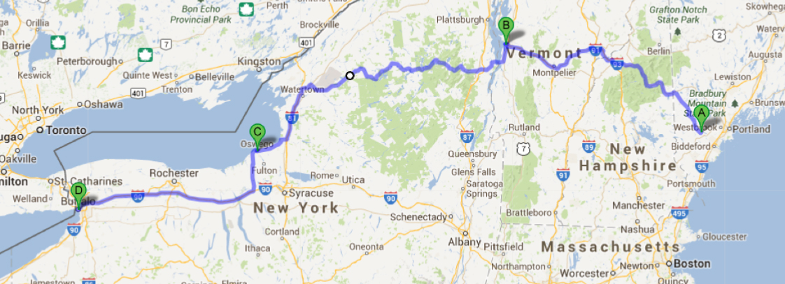 Sunday evening we’ll be traveling to Burlington, VT. From there we’ll be going through the NY Mountains to reach Oswego, NY, monday night. Why Oswego? I am hoping to find out more about the two women who did the around-the-world tour in an FC. They were teachers at the University there.