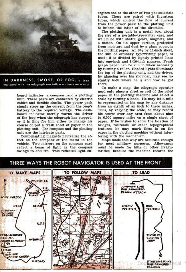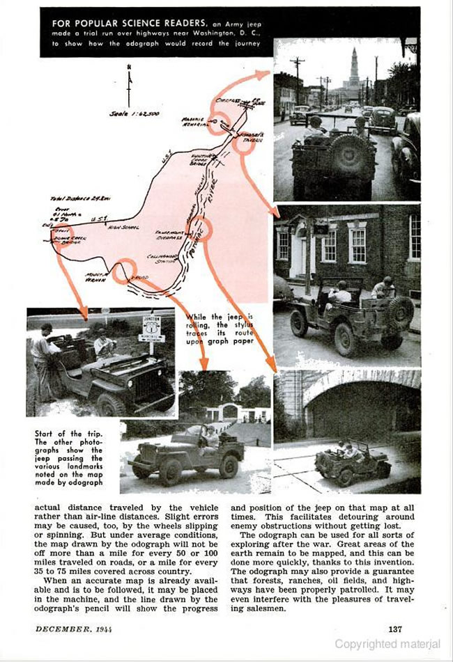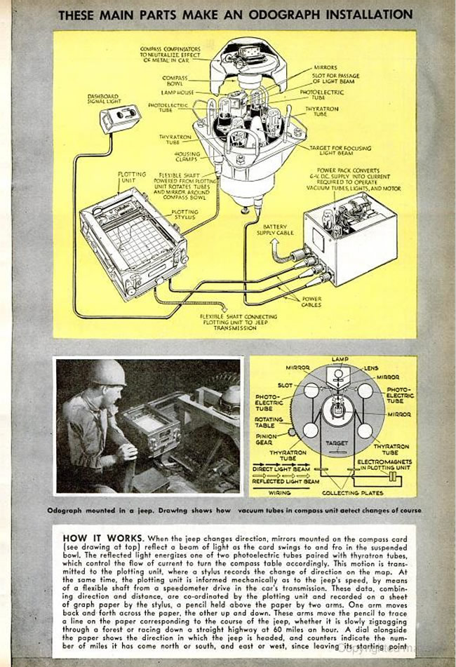 An article about the Odograph was published in the December, 1944, issue of Popular Science. At 200 pounds, the Odograph auto-created maps as soldiers navigated towards some objective. I couldn’t locate any records that indicate how many were made (anyone know), but there it appears there are nine jeeps that still have them (based on the latest info I could find). I found a few different references about it over at G503.