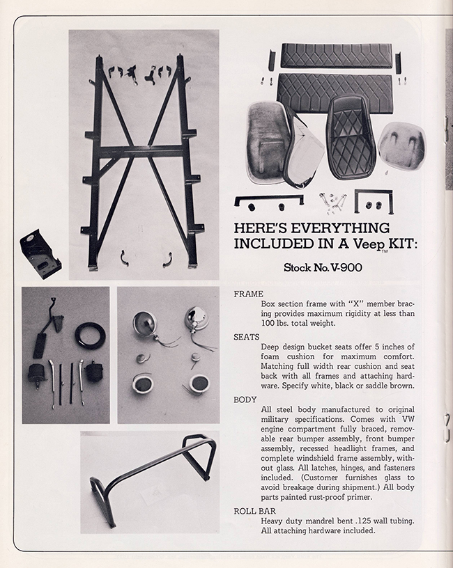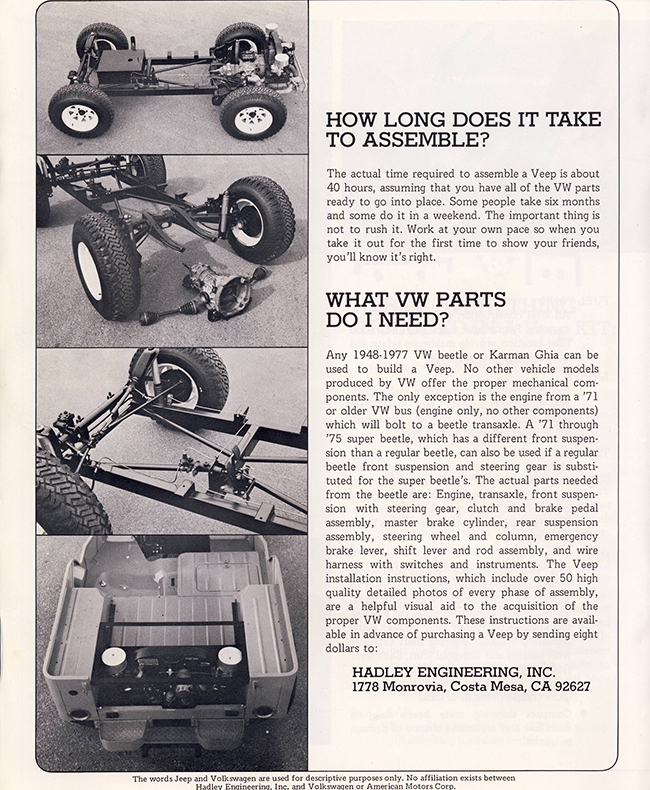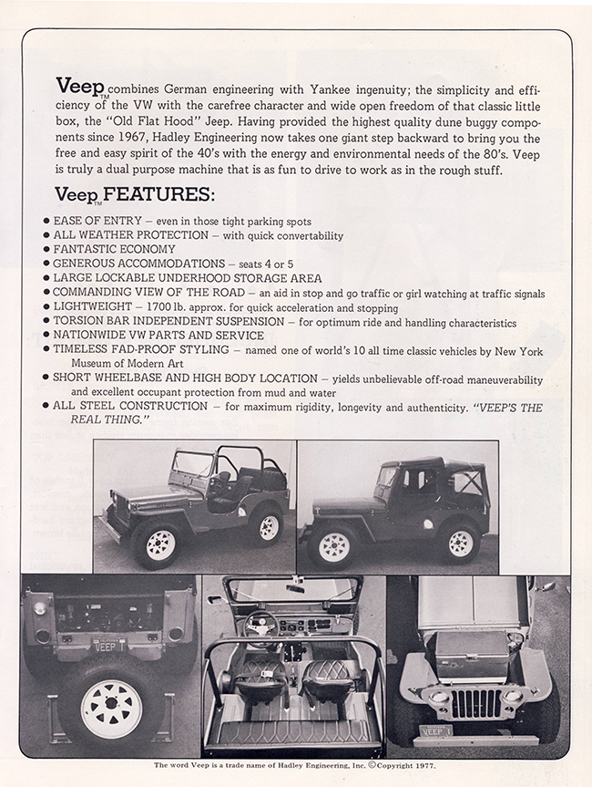 Paul was kind enough to share this very rare Hadley Engineering VEEP brochure in the hopes that it helps the VEEP owners out there who struggle to find information about their vehicle. Below are photos of the basic brochure. I also have assembly instructions that I haven’t scanned yet. Great stuff! One unique item I hadn’t notice before was the stamped ‘VEEP’ in the hood. I’ve never seen that in any production VEEPs. If you ever run across a hood with VEEP stamped in it, I’d be interested to get some photos.