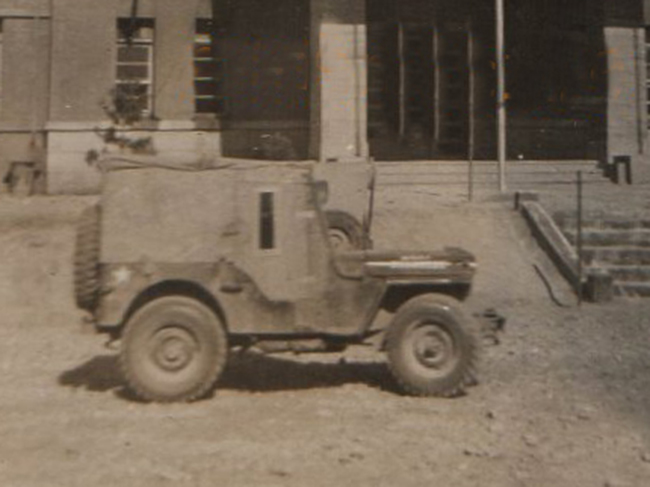 Taken at the USAF Base at Yokota, Japan, the photo shows a jeep with an unusually narrow window on the door.