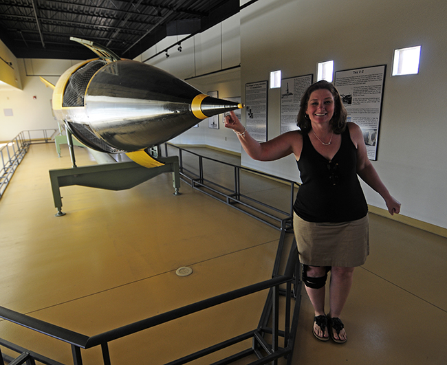 Once we were done with the interior exhibits we walked to a second building where a US Made V2 rocket (the one in the photo above???) rests. My wife almost touches the rocket in this photo . . . that is my story and I’m sticking to it.