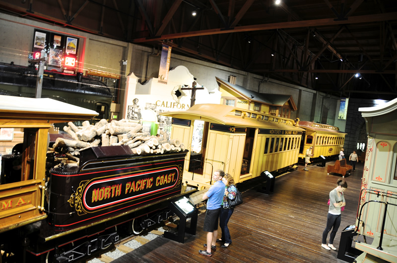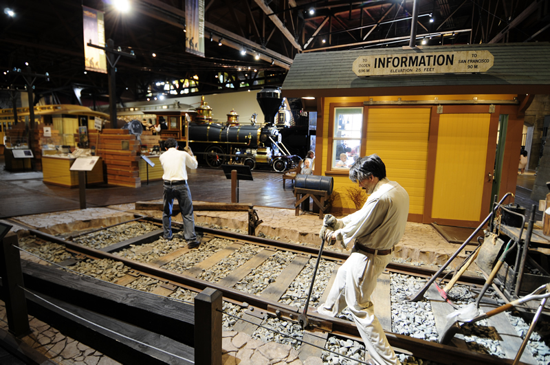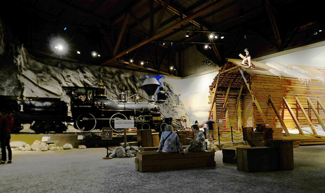 Having seen quite a few museums over the past two years, I’ve formed some strong thoughts on the use of large and small spaces as part of the story telling process. For example, the California Auto Museum has a large warehouse feel with some low dividing walls between areas, but there’s not much of an attempt to change the sense of space. In contrast, the Railroad museum begins with a small display in front near at box office, which leads to a small tunnel. As you exit the tunnel, a huge, dramatic space opens up that is delightfully overwhelming. The huge space begins the California railroad experience at a natural starting point: The Transcontinental Railroad (an aside: My kids loved ‘Ten Mile Day‘, a book that I picked up years ago at Golden Spike National Monument).