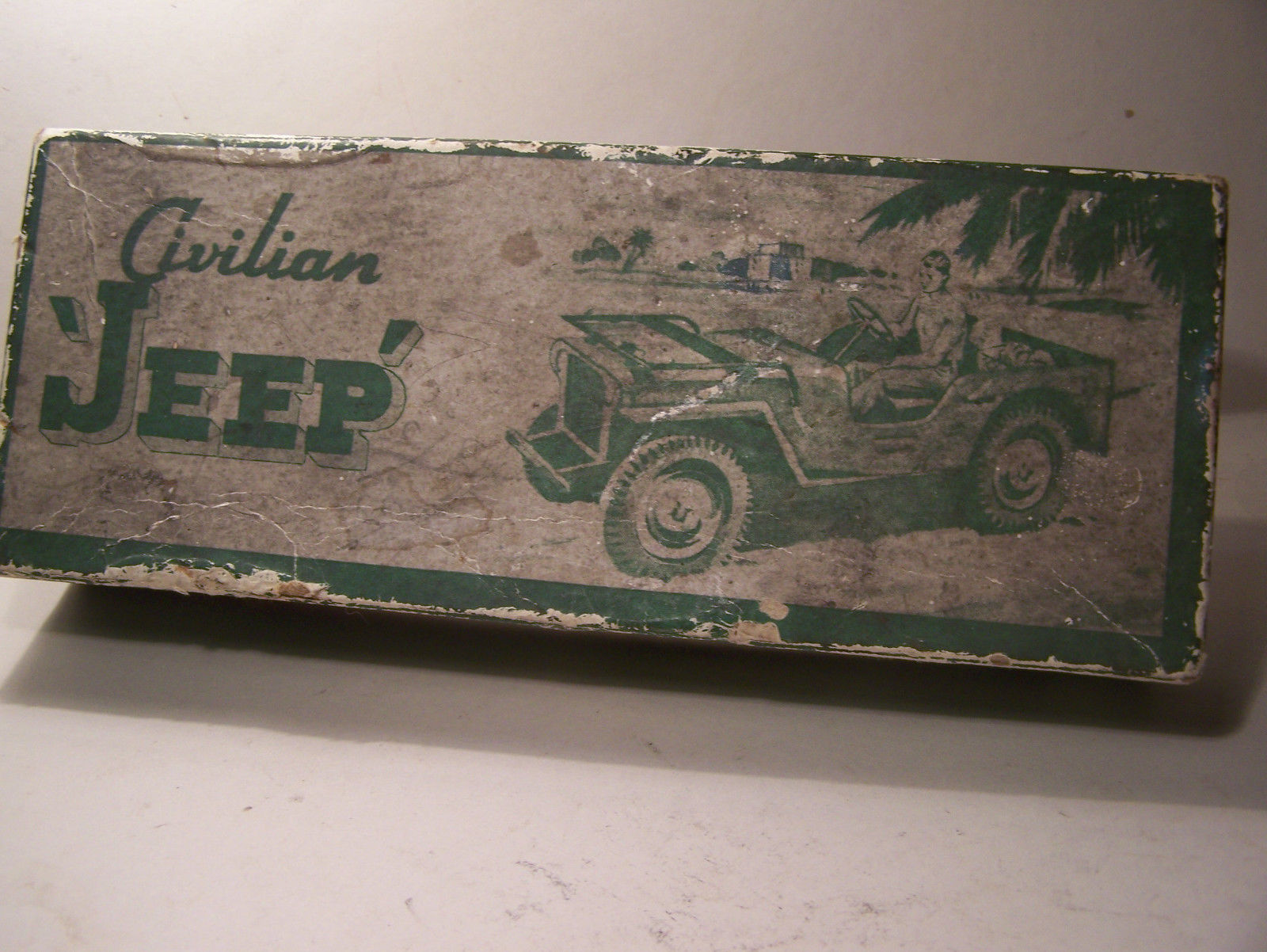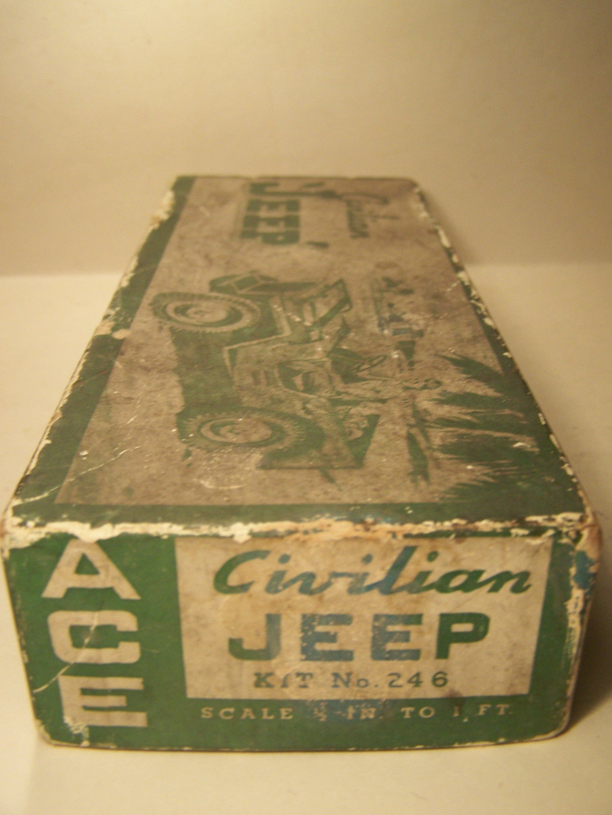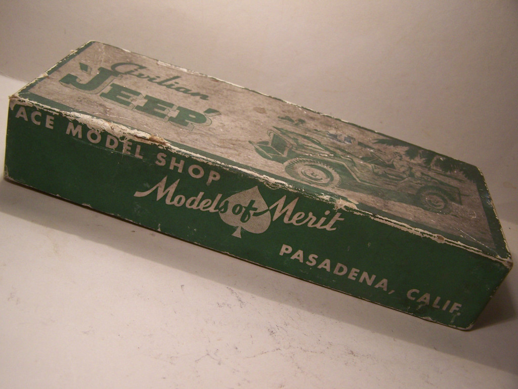 “Great dusty old relic from our WW2 past. Empty Civilian jeep “ACE” model jeep box.The Willy’s Jeep evolved into the CJ Jeep “The Civilian Jeep” because of it’s popularity during WW2. The box is discolored from age, and has a bit of paper peeled from one end, please view all photos as they are part of the description. The interior of box is pretty sound structurally. The box measures 8 1/8″ long, 3 1/8″ wide and 1 9/16″ tall. This little survivor would fit in well with a WW2 Collection.”