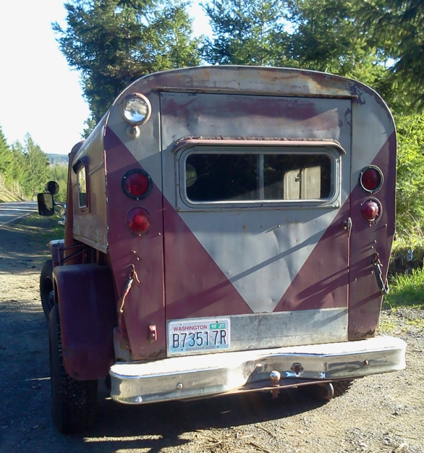 Those windows were commonly used on trailers and campers of that vintage. Look at the trailer behind in the B&W. The construction is pretty simple and would not be difficult to duplicate. Finding a large window for the rear looks the most challenging.