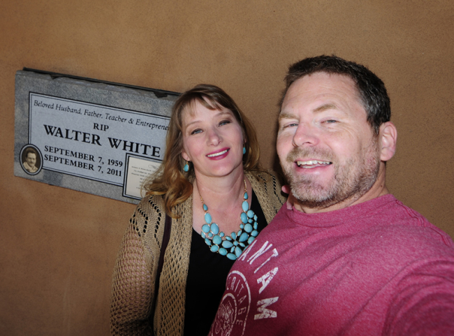 With that background in mind, our first item of business was to find the real gravestone marker for the mythical Walter White. The headstone was initially put into a real cemetary, but some reasonable complaints caused it to be moved to a small strip mall. When we arrived at the mall, the location of the headstone wasn’t obvious. We had to look around before spotting it in an outdoor alcove. Ann was particularly pleased, because this was her idea.