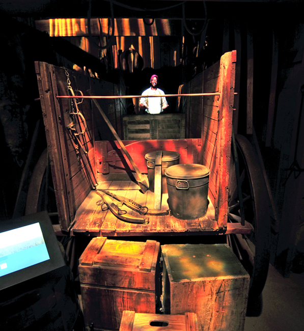 In the foreground is a wagon and some boxes. While it looks like a man in the background, it is actually a video projection hologram. The effect was excellent as the story tell spun his tale. To the lower right you see a video screen that is used to select different narrations. These type of exhibits were shown throughout the museum. It’s one of the best uses of interactive video I’ve seen in a museum.