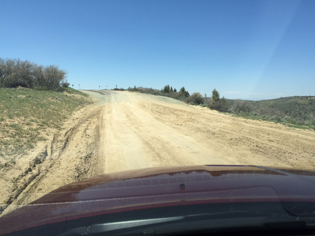 Once on it, we encountered gravel and washboard. Fortunately, that only lasted about five miles. We followed the main road for twenty minutes or so until we reached the foot of the cliffs. Then the road turned into flat dirt with no gravel.