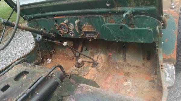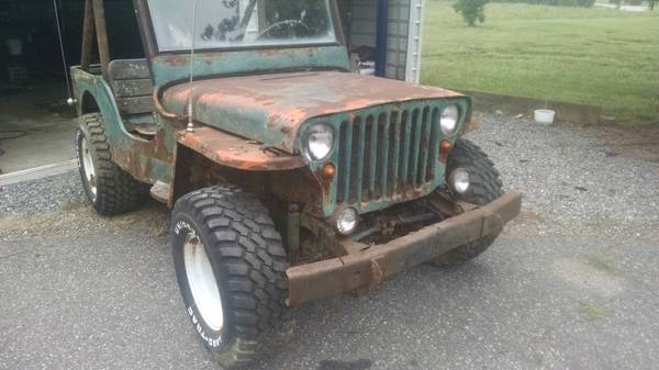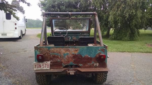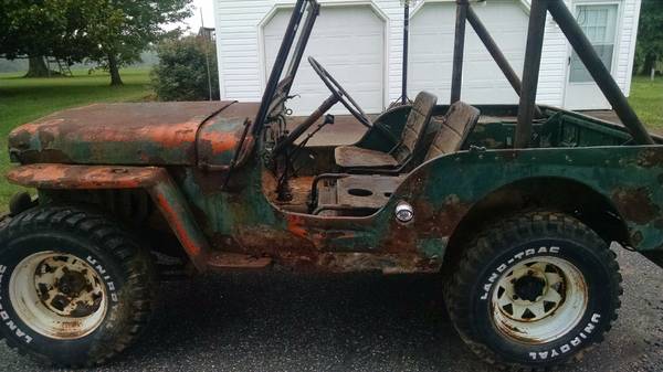 “1945 mb military jeep.body is good,with some repairable rust in the body,gas tank well is rusted out.It has a later cj or mc engine.The engine has not run in 4 years but is free and has good compression.It has a thin skim of bondo and the paint and bondo are peeling off.which makes it look bad.It has the correct T84 transmission and transfer case. the rear panel is in good shape.I have the correct clear nc title for this Jeep.”