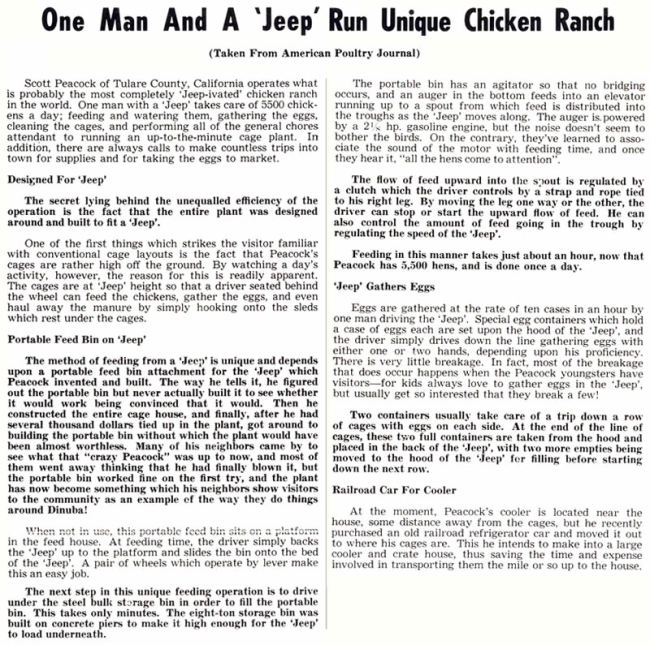 The April 1955 issue of Willys News included this article and excerpt from the June 1955 issue of American Poultry Journal.
