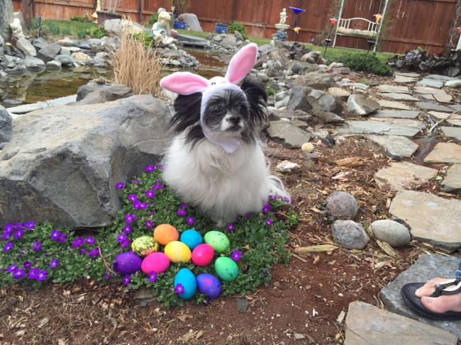 Zollie (a male) is a Shitzu Pomeranian. He’s more cat than dog, fearful of his own shadow. He’s most brave when camped under our bed. He tolerated the situation as best he could, even if his expression suggests he’s being tortured. Those are his Easter bunny ears.