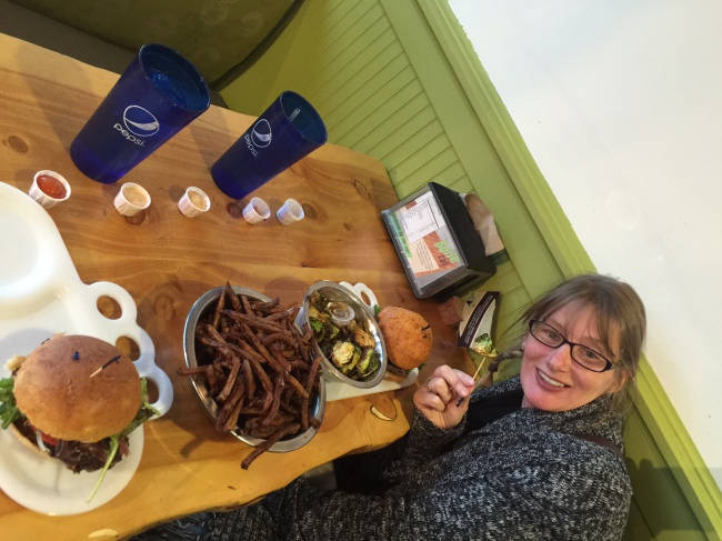 Next we ate dinner at the Boise Fry Company. The burgers are good, but it is really the fries that bring you back. In the bowl is a large order of purple potato fries (they have 7 or 8 different kind of fries you can choose and something like 10 different dipping sauces as well). Next to the bowl of fries is a bowl of brussel sprouts that were very good. It was the first time we’d seen those on the menu and we’ll order those in the future as well. 2016-pasco-twinfalls-zollie