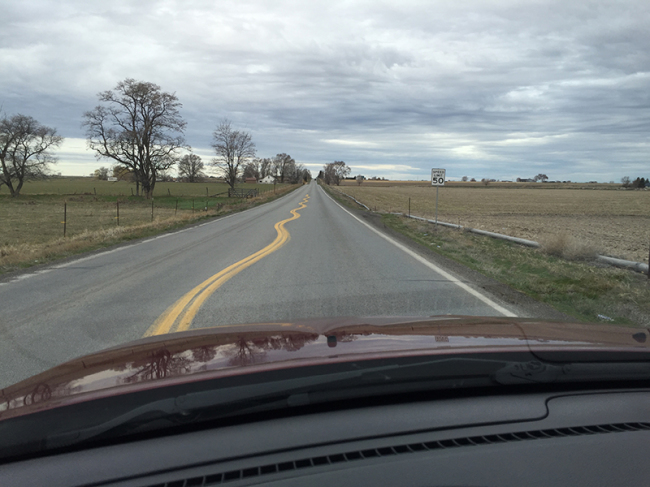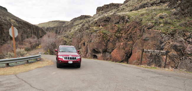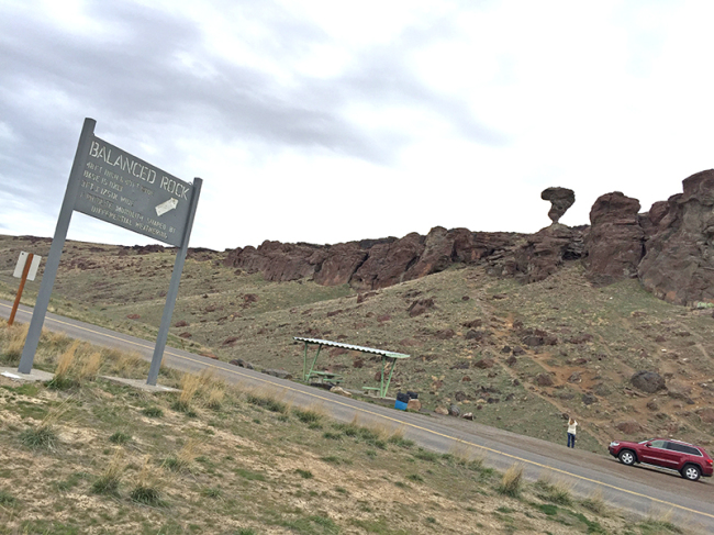 Our first destination on a cool Thursday morning was the county park near Buhl, Idaho, called Balanced Rock. We followed Highway 93 through Twin Falls, then veered south until reaching E 3700 N Road. We took a right and encountered the strangest center line. After much discussion, we concluded it was a disgruntled county employee who’d had enough of life: too many straight lines.