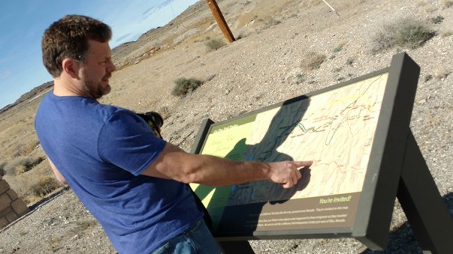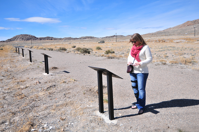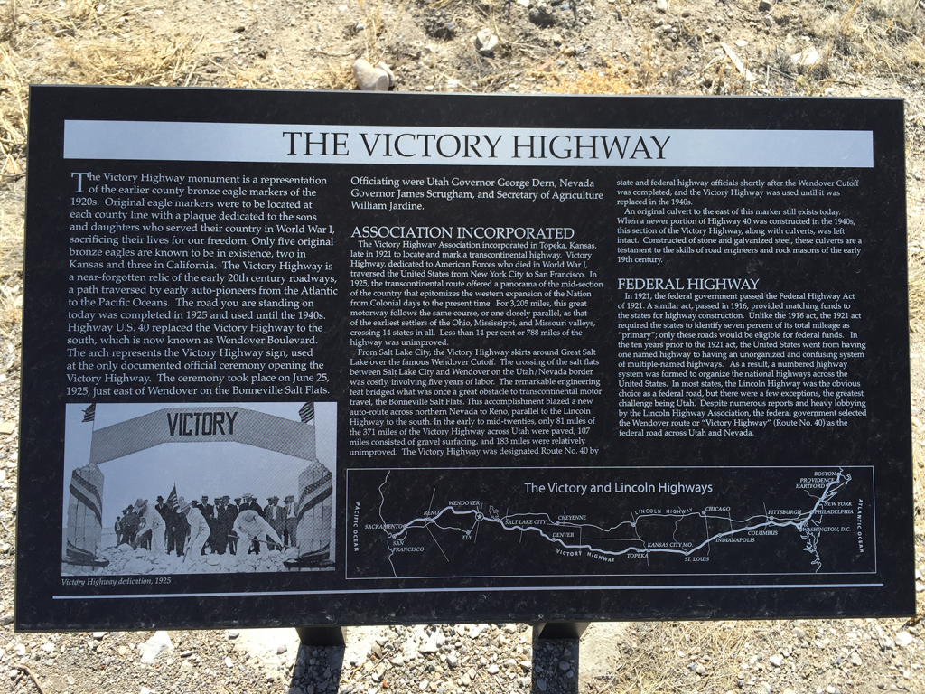 We followed 93 until it intersected with I-80, then headed east on 80 until reaching West Wendover, Nevada. There, we stopped for a photo with a ninety-foot cowboy. We also read about the Victory Highway markers.