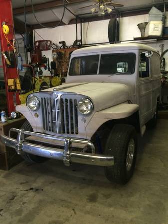 “1948 Rare Willys sedan delivery 4×4 265CI V8 Chevy engine, Muncie 4 Speed transmission, Dana 18 transfer case, AMC 30 front axle, AMC 20 rear axle, painless wiring harness, tilt column, power steering, brand new Mickey Thompson 8 holes wheels 6 lug, brand new national XT Commando tires, new aluminum radiator, new shocks, Nice ride just needs paint and minor finishing or ready to go now as is runs and drives head turner.”