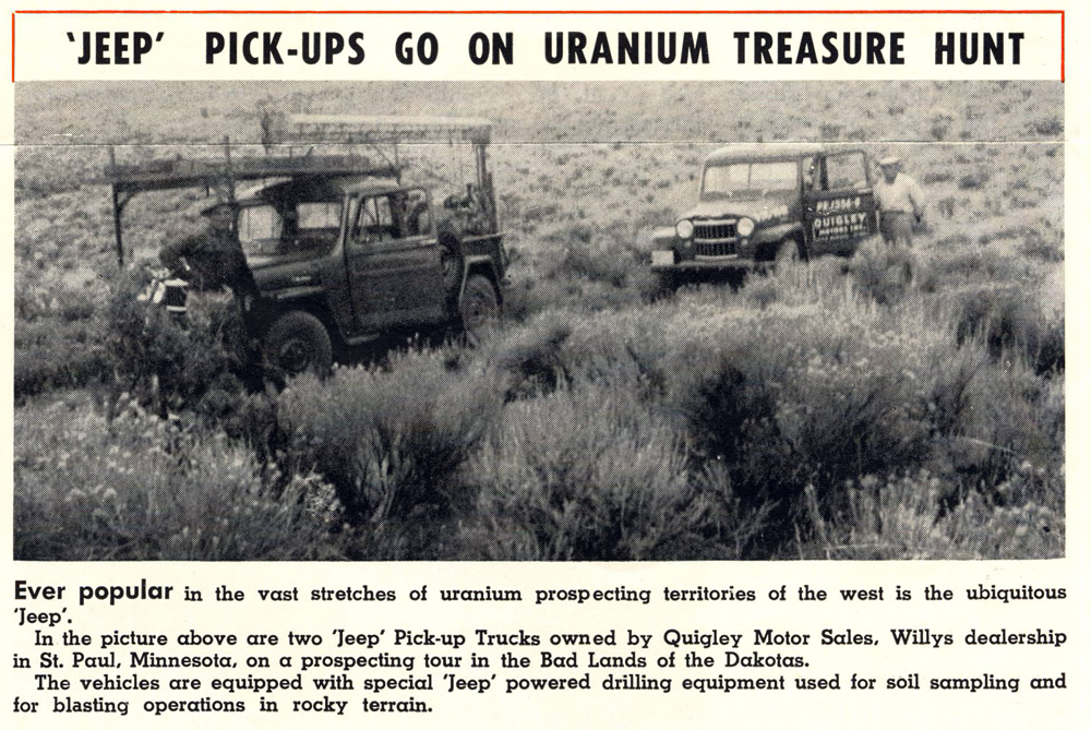 The January 1958 issue of Willys News included a photo of two intrepid uranium hunters using Willys trucks.