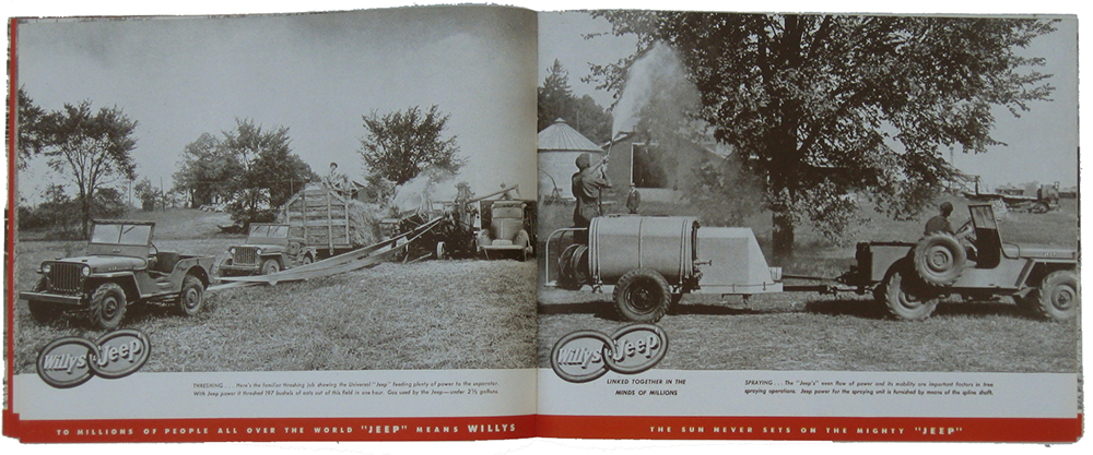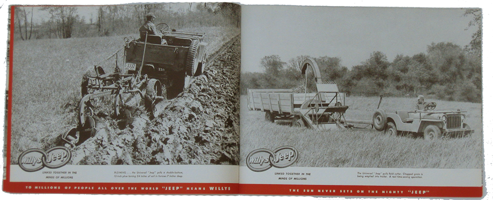 jeep-planning-brochure3There is also great images of some Military Jeeps. The big differences in most of the Jeeps pictured are things like Solid Disc Wheels, Spare Tire mounting positions, Jeep windshield and hood badges, early CJ2 and Ag Jeep numbers on the bumpers, Full Floating rear Ends and left side Drum Pulley Mounting ,Etc Etc .