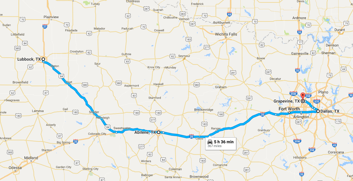 Our path from Lubbock, to Abilene, to Dallas (rented a car for two days), and then to Roanoke for the night.