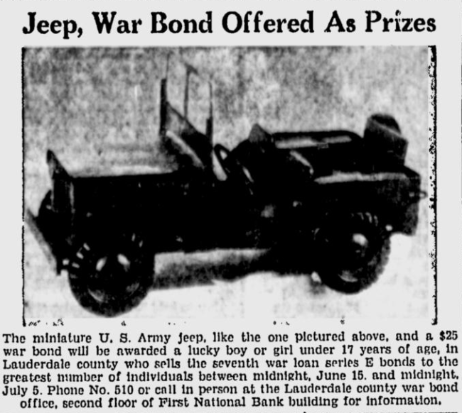 This June 14, 1945 photo shares the news that some kids in Florida received toy jeeps in exchange for selling the most war bonds.