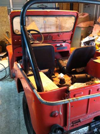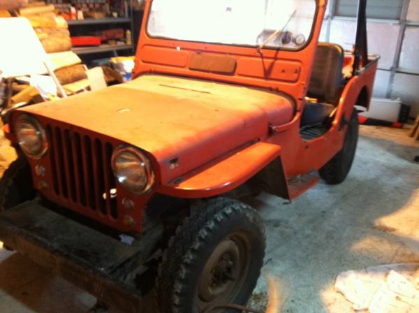 “Selling my willys. When I bought it I was told it was a 1953 willys cj3a but someone who came because they needed a cj3- says it is actually a 1948 cj2a with a cj3a windshield. Either way It is a willys project. floor boards have been replaced. Only reason I’m selling is because I have too many projects. 4cyl engine partially installed – never heard it run but makes compression when turned over by hand. its still a 6v system. have the generator, but no starter. Solid – has some rust underneath but well worth the time and effort. no title bill of sale only. ”