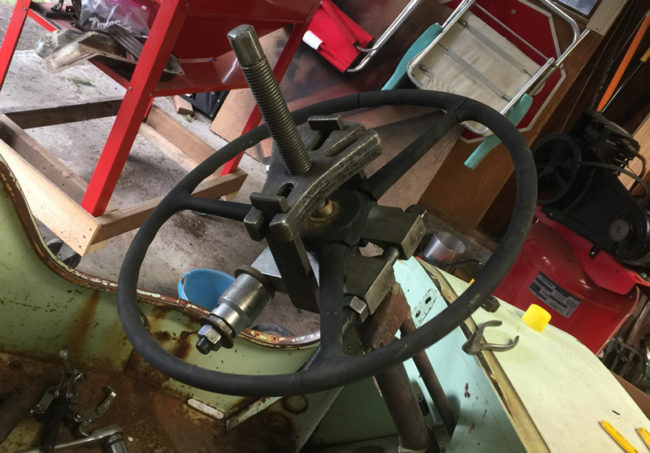 My next task was to remove the body. It’s important to know that I’ve never worked on a stock early jeep, so I’m learning a few things on the fly, such as how to remove the steering column. Removing wheel was pretty easy, but I did discover I was missing some of my bearing pullers, so I had to combine two different pullers to remove the wheel. That poor wheel is in terrible shape. It was no longer round, with lots of plastic missing. I will have to get another one.