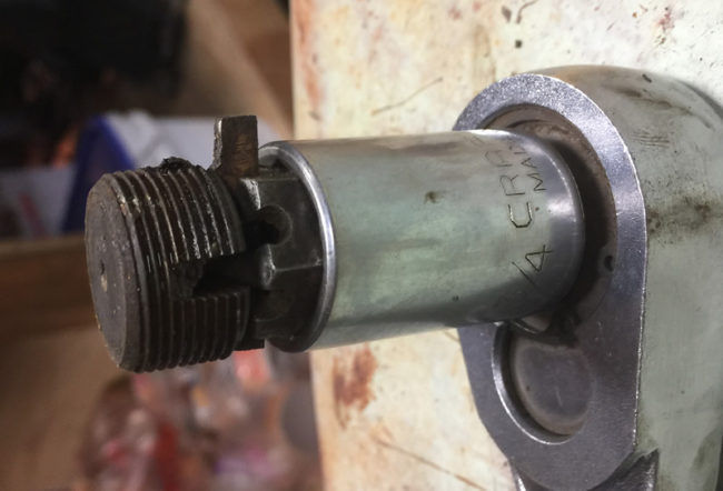 After removing the bolts, I discovered (after view additional videos) that I had to unscrew the drag link cap. Naturally, I didn’t have a drag link tool and I couldn’t find one for sale at Harbor Freight (online anyway), so I made one using a piece of steel and a nut built for cotter pins. But, the bolt had to be positioned near the top of the socket, so I stuffed some washers and another bolt down in it.2017-04-09-rusty-steering2