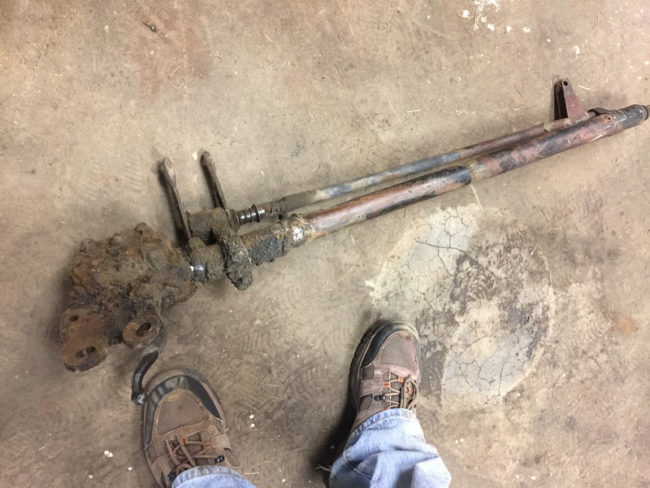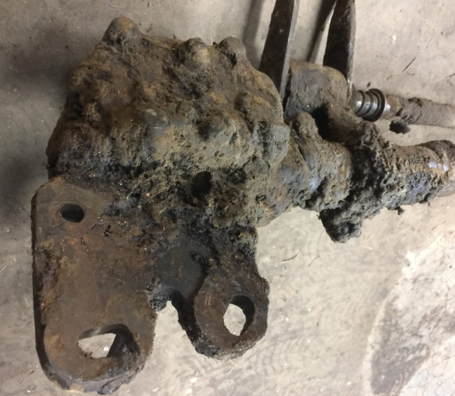 2017-04-09-rusty-steering3Here’s a good photo of the crap all over the steering boxy. I might just have to use a pick-axe to get all that off!