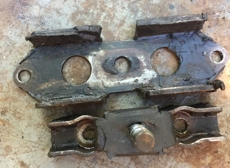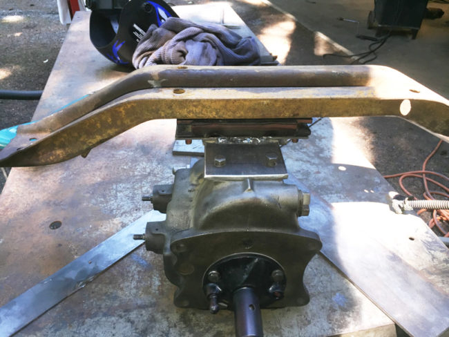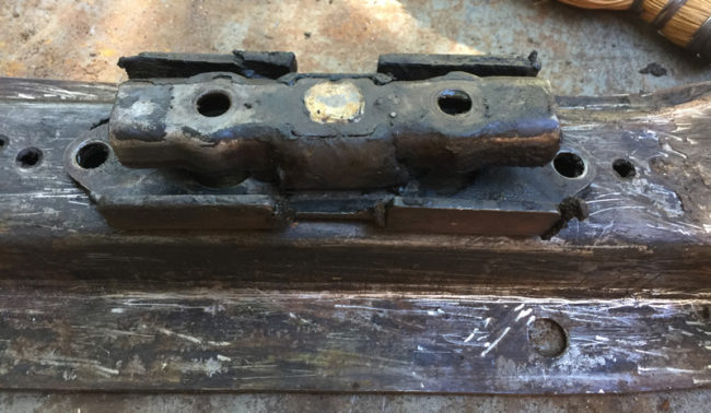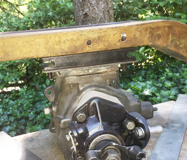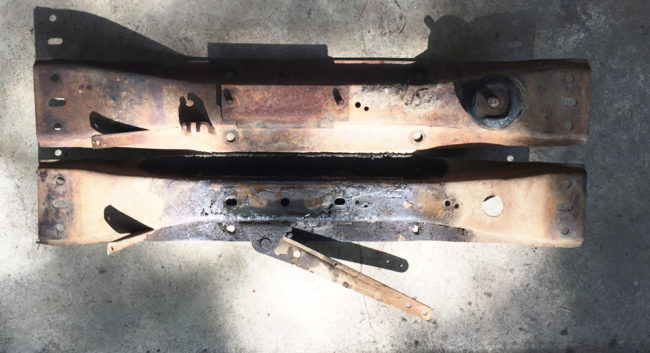Unfortunately, as I disassembled Patterson’s crossmember I ran into a couple problems with the rubberized mount for the transmission. Here’s a look at what I pulled off of Patterson. Note how narrow the two holes are for mounting the rubber piece to the transmission (too narrow for a standard T-90 mount: