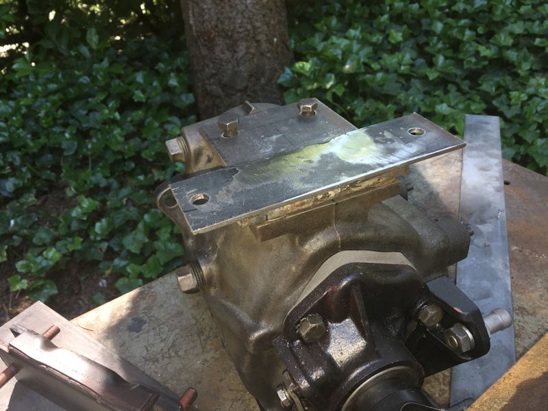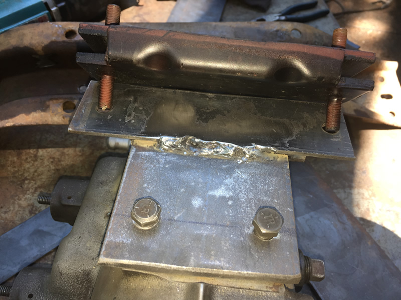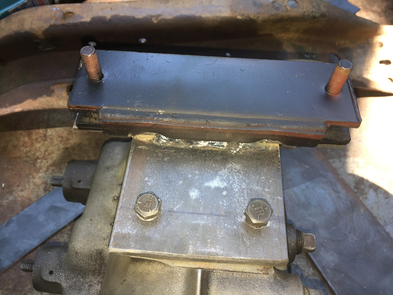 The unpainted mount below can be bolted down with the two far bolts which are at the front of the tranny. For the two rear holes, I welded bolts to the new mount plate that allow the bolts to slide the holes I bored out on the tranny. Then, nuts will secure the plate in the rear.