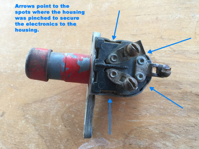 Unfortunately, recrimping the sides won’t be easy without my big vice, so I rubber-banded the unit together. Then, I set my electrical tester on Ohms and tested it. The switch works perfectly now. I’ll clean it up and reinstall after crimping it with my big vice in Seattle.