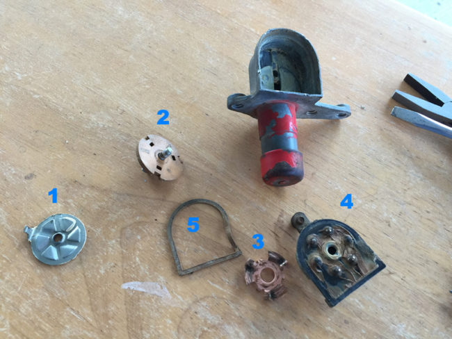 - Part #3 connects with copper highpoints on #4, which shifts the electricity from the high beam to the low beam, then to the high beam, etc, in a circular pattern. The contacts on #4 were dirty, too, but hard to clean without scraping the copper points. I did not have a good cleaner handy, so I only gently cleaned them.