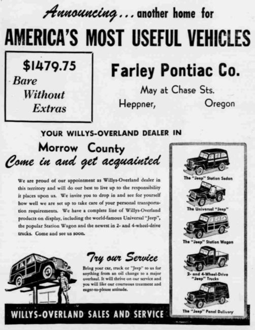 Another Willys ad from Eastern Oregon. The ad was published Thursday, October 27, 1949, in the Heppner Gazette Times.