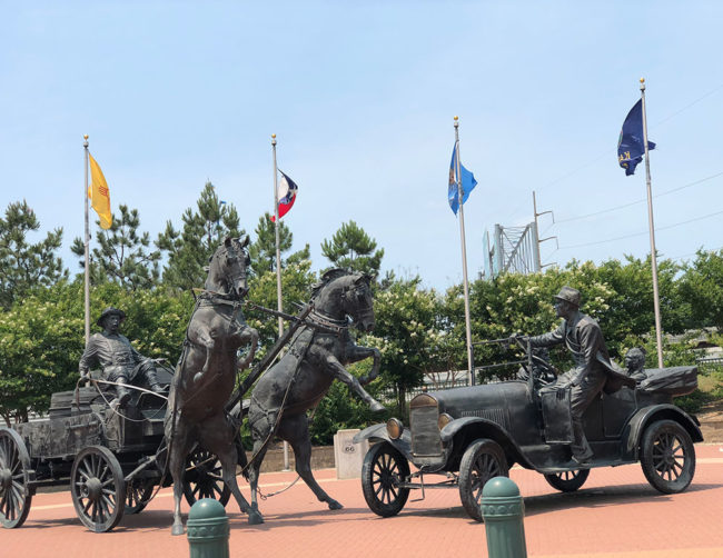 On the West end of Tulsa, this East-Meets-West sculpture as next to the Route 66 glass walking bridge below. But, finding a place to park to make it easier for Ann to access proved difficult (so we didn’t stop). You can learn more about the sculpture’s meaning here.