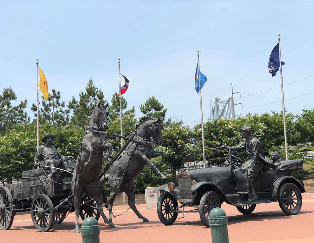 After gorging myself, we left for a look at the Land Run Memorial in downtown, Oklahoma City, which commemorates the April 22, 1889, Oklahoma Land Run. By the time we arrived at the memorial, which is on the other side of the parking lot from Bass World, it was 95 degrees and somewhat humid. At least, the wind was blowing. Despite the heat, we enjoyed these bigger-than-life statues immensely.