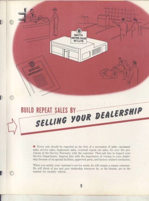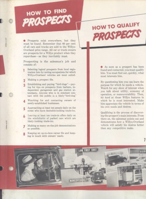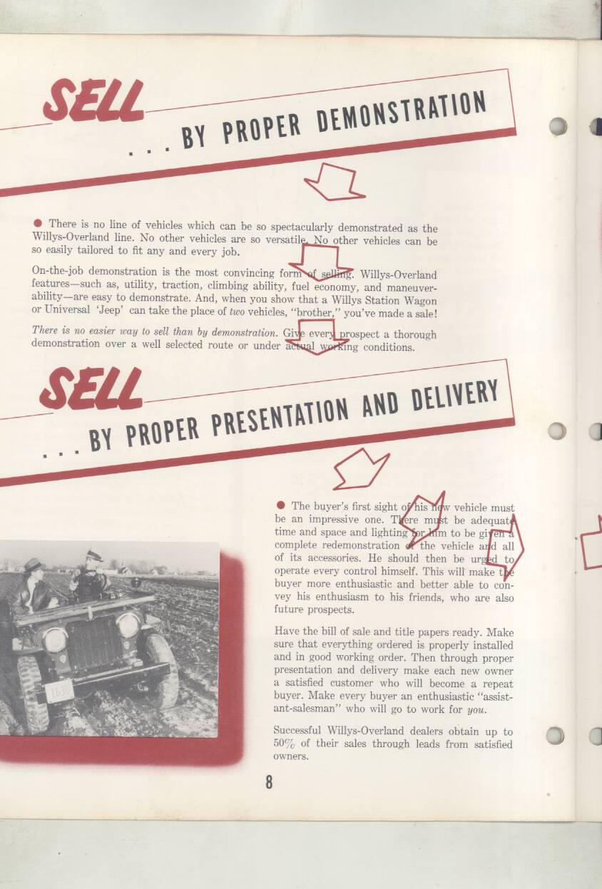 “Original salesman’s part color catalog , 8.5 x 11 , 12 pages , 3 file holes at edge , also includes non color sales sheet , 8.5 x 11 , 2 pages , shows various Willys features , descriptions , etc .”