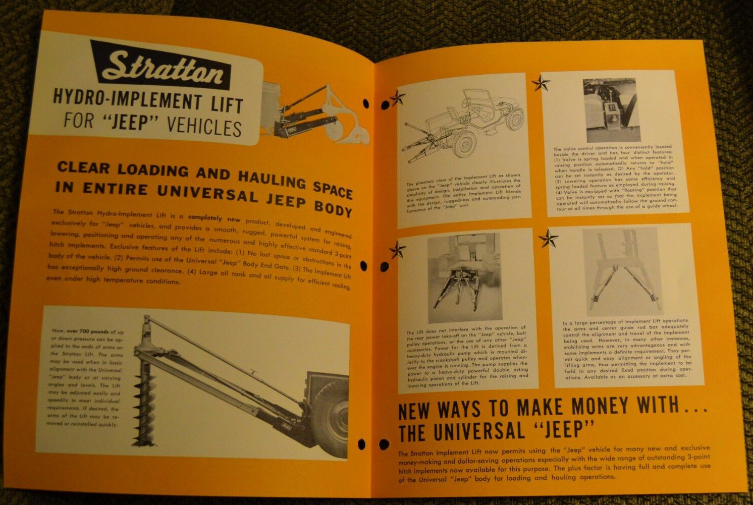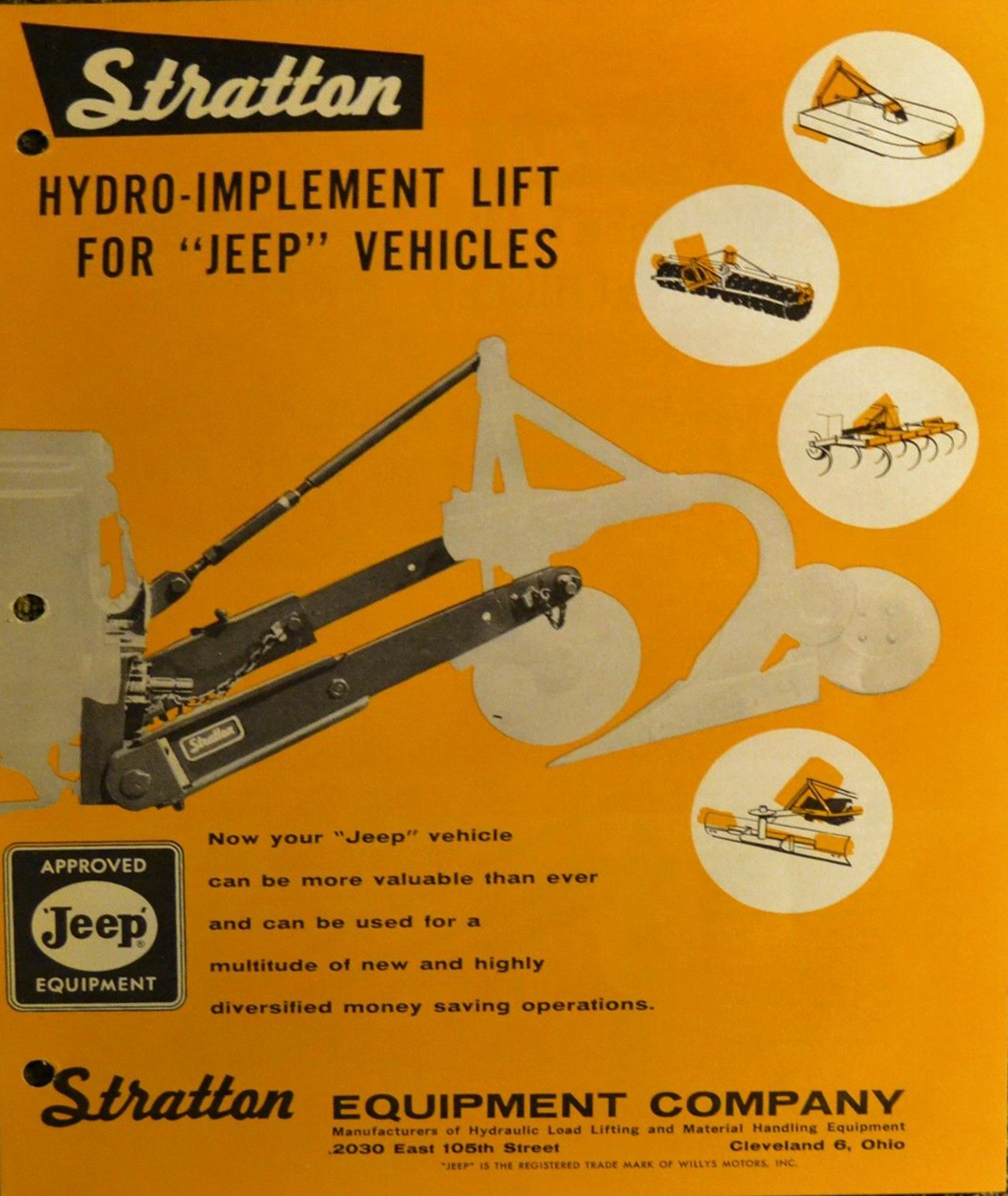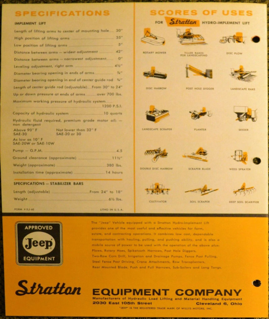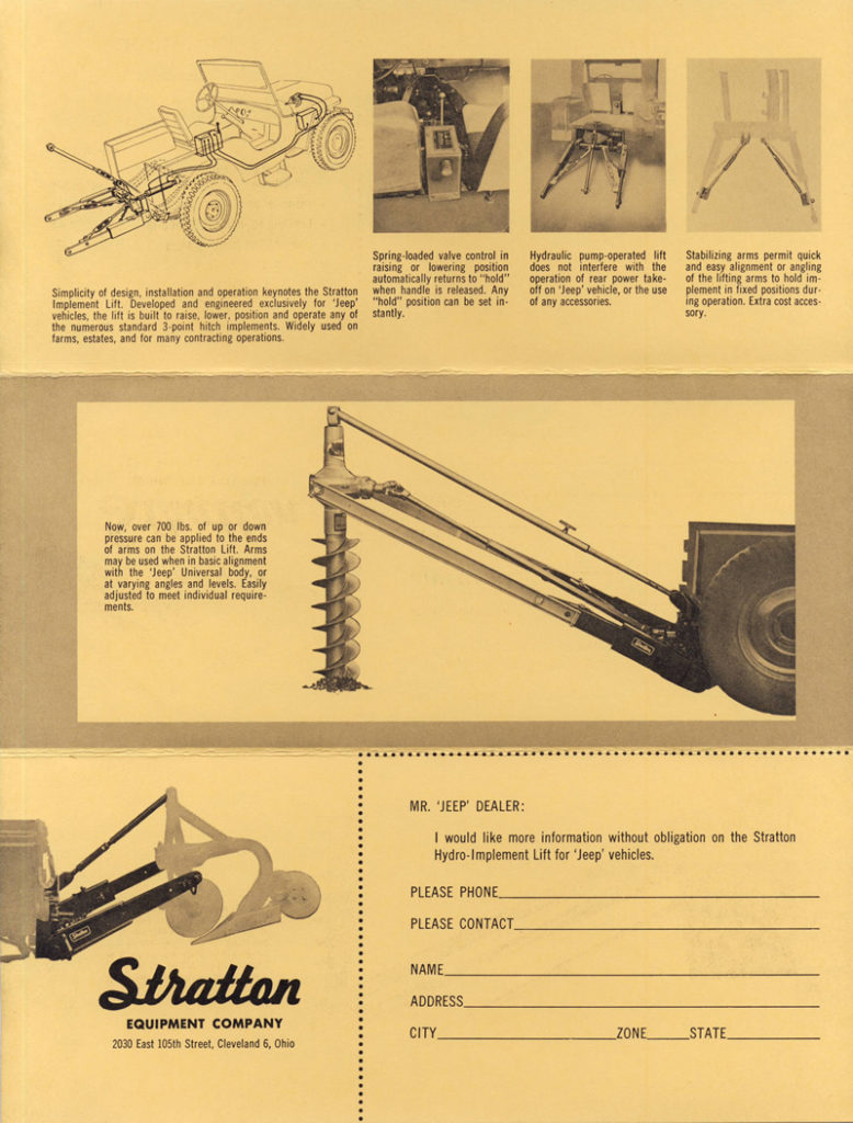 As early as 1949 Stratton Equipment out of Cleveland, Ohio, was marketing hydraulic products. One example was their truck lift, a hydraulic lift used for placing cargo onto truck beds. The lift is pictured at the top of page 146 in the October 1949 issue of Popular Mechanics. This was just one of multiple patents filed over the period of three decades (1940s-1970s) by Alfred F. Foote, product designs both jeep-related and non-jeep-related.