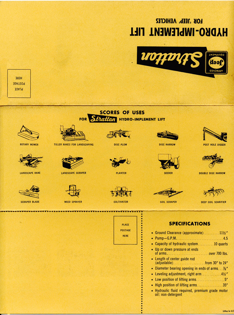 As early as 1949 Stratton Equipment out of Cleveland, Ohio, was marketing hydraulic products. One example was their truck lift, a hydraulic lift used for placing cargo onto truck beds. The lift is pictured at the top of page 146 in the October 1949 issue of Popular Mechanics. This was just one of multiple patents filed over the period of three decades (1940s-1970s) by Alfred F. Foote, product designs both jeep-related and non-jeep-related.