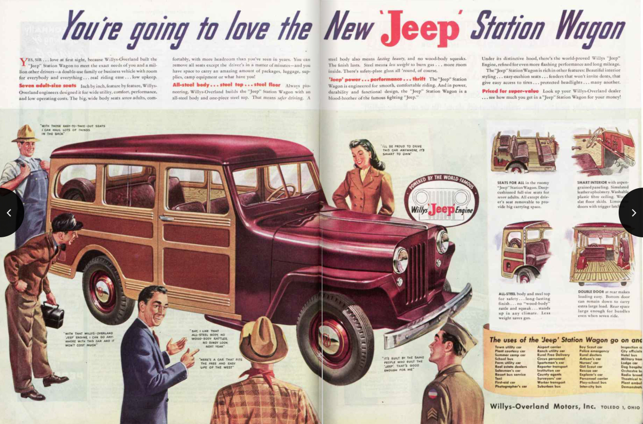 As you can see in the introduction ad (A New Chapter), it was matched with the announcement of the Willys-Overland Jeep Station Wagon, though the ad hides the wagon in anticipation of its summer of 1946 launch.