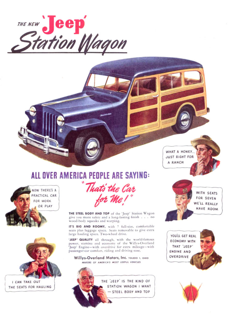 As quickly as the badge appeared, it disappeared with the same speed. For the October 1946 ad, which included a wagon in it, the Saturday Evening Post seemingly replaced the engine badge with a smaller badge, one with a “W” over the “O”. It’s the earliest jeep ad I can find with that badge (if anyone knows of another, earlier ad, please let me know).