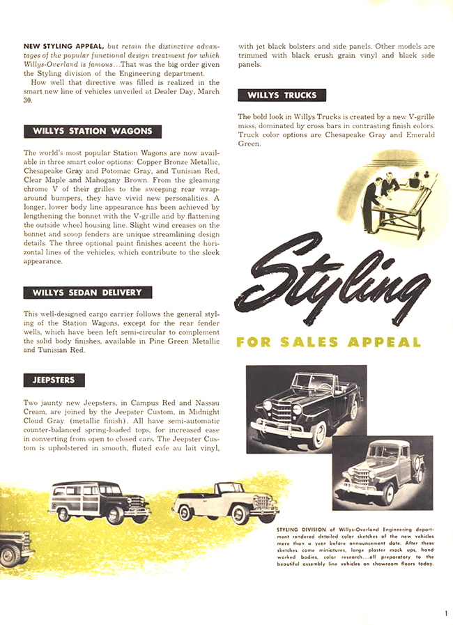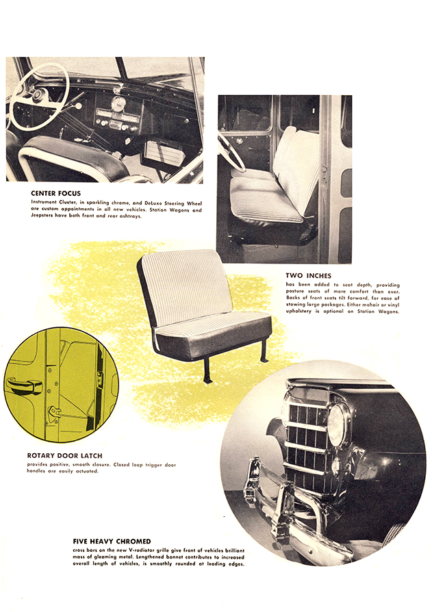 The actual introduction date of the 1950 engine and styling changes is shown as March 30, 1950. Been looking for this exact date for years. Makes the actual date of the changeover more realistic and we know the date of the new style as opposed to the end of the flat nose 46-early 50 front end and the Go-Devil engine in the Jeepsters, pickups, sedan deliveries and wagons. Really great brochure Dave. Thanks for sharing it!